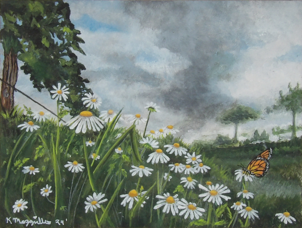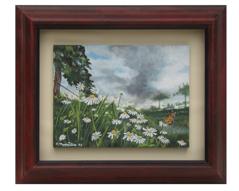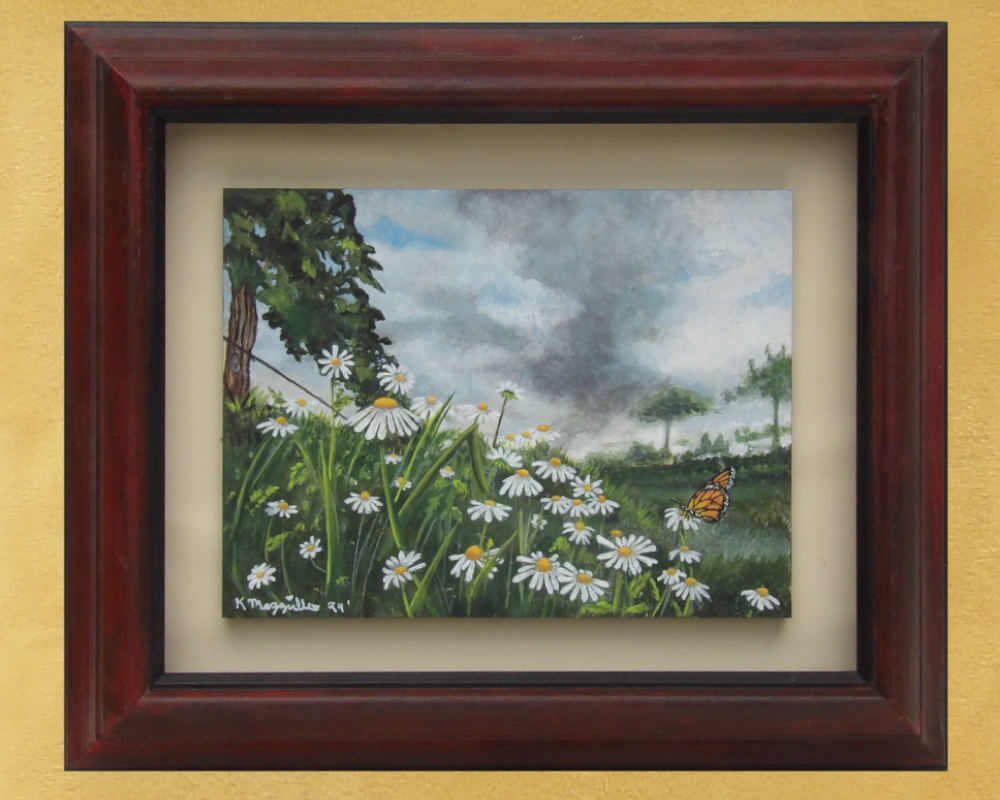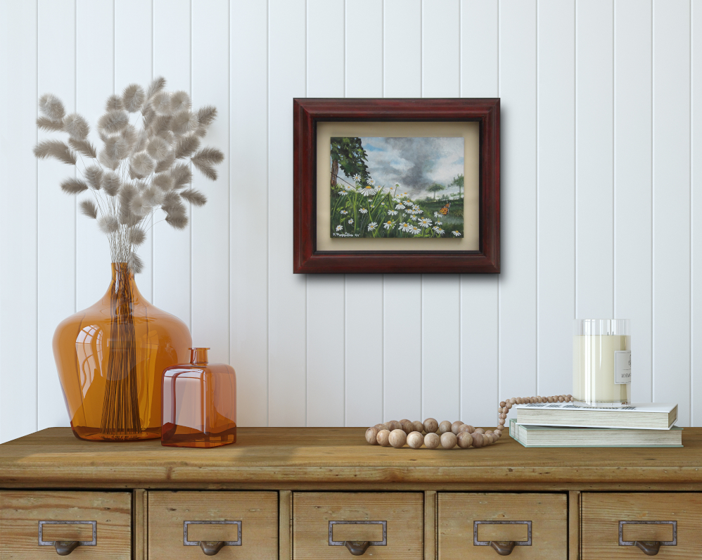 This original one-of-a-kind satin acrylic/oil gesso board landscape painting is signed, dated and titled: "Spring May Flowers", it will make a great addition to your home or office. I took this photo at the Williamsburg Winery in Williamsburg, VA after a rain shower and the clouds were moving away and the daisies were in the field along with a monarch butterfly. It was so peaceful with the grape vines in the background as they are started to bloom. It comes in a uniquely made rich brown wood shadow box style frame ready to hang. The back is a black wood board backing with an artist label, and bumper guards to protect your walls. This will make a perfect gift for someone who loves landscapes.