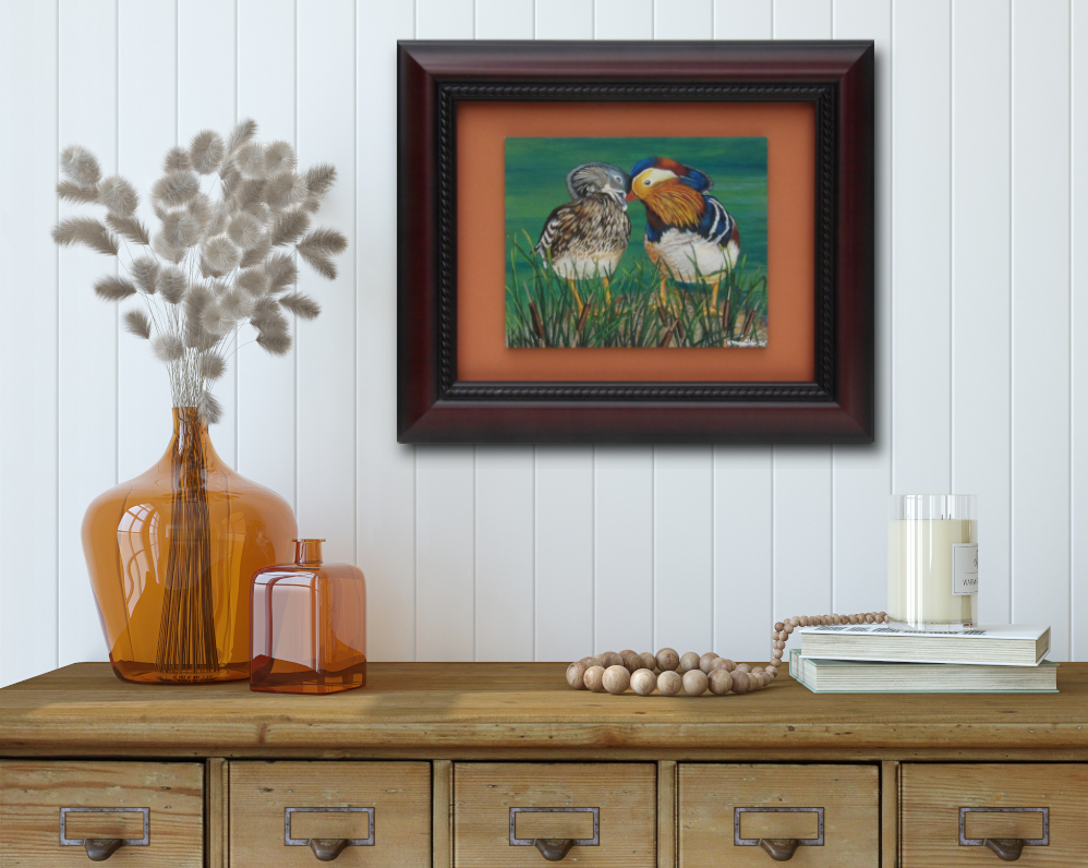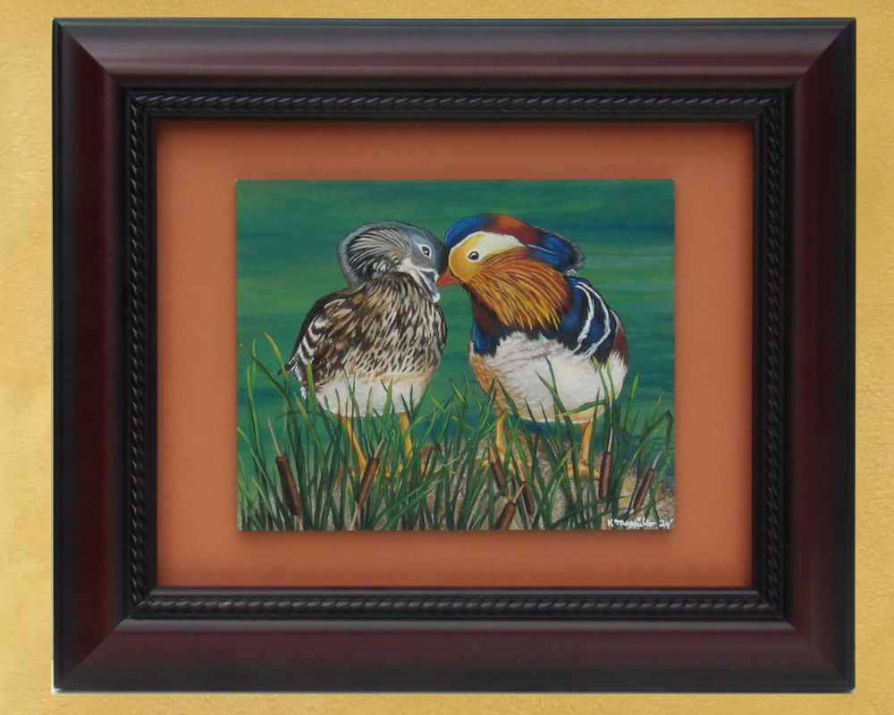 This original one-of-a-kind satin acrylic/oil-based gesso board Two Mallard Ducks painting is signed and dated. Titled: "This Is Love", it will make a great addition to your home or office. Ducks mate for life and these two snuggling birds love standing on a rock in front of cattails. It comes in a uniquely made rich black and brown mahogany wood shadow box style frame with rope trim, and black background. It's ready to hang. The back is a black wood board backing with an artist label. This will make a perfect gift for someone who loves ducks.