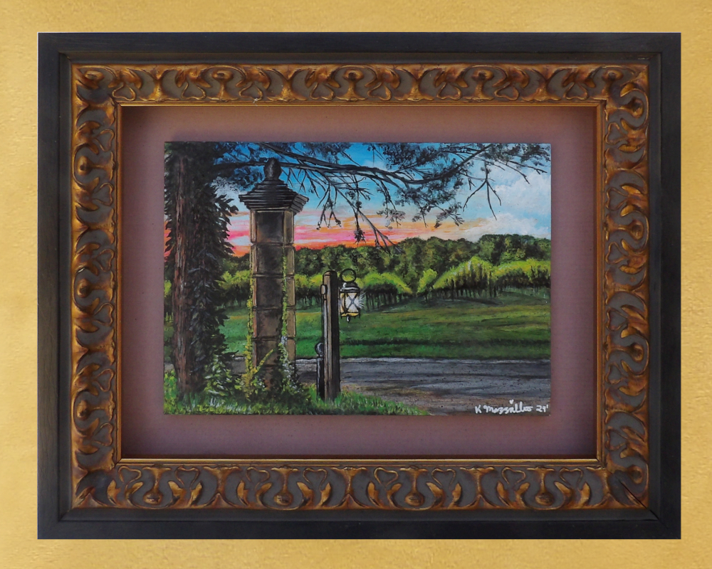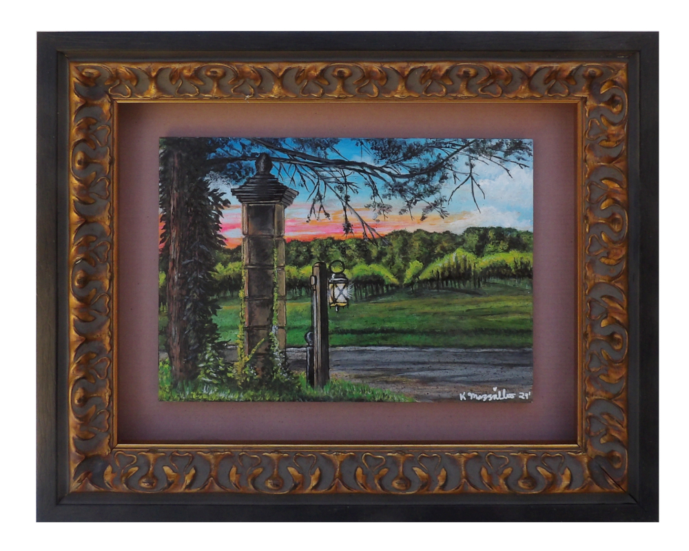 This original one-of-a-kind satin acrylic/oil gesso board Winery Landscape Painting is signed, dated. and titled: "Summer's Evening Guiding Light", it will make a great addition to your home or office. I took this photo at the Williamsburg Winery in Williamsburg, VA as the sun was setting and the light came on. I felt the tranquility as the sun was setting and you could see the grape vines in the background as they are blooming and will be harvest in the fall. It comes in a uniquely made rich black and antique gold wood shadow box style frame with filigree trim. It's ready to hang. The back is a black wood board backing with an artist label. This will make a perfect gift for someone who loves sunsets at a winery.